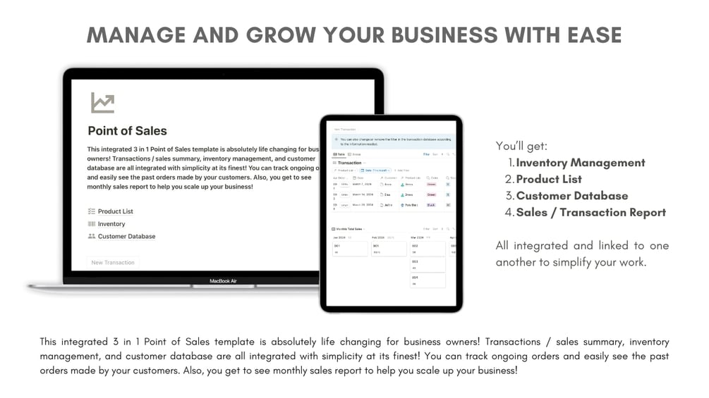 You’ll get integrated Inventory Management, Product List, Customer Database, and Sales / Transaction Report